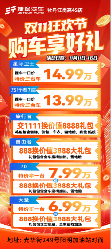 [牡丹江,2025/11/11] – 随着双十一全球购物狂欢节的临近,消费者的购物热情已被全面点燃。今年的双十一,您准备为谁“清空购物车”?捷途汽车诚意提醒:是时候为自己和家人的“出行自由”买单了!11月11日,捷途汽车将于【尚高展厅】 举办“双十一专场展厅团购会”,打破线上购车壁垒,带来一场看得见、摸得着、谈得拢的线下购车盛宴,让您享受比线上更实在、更透明的“硬核”福利!